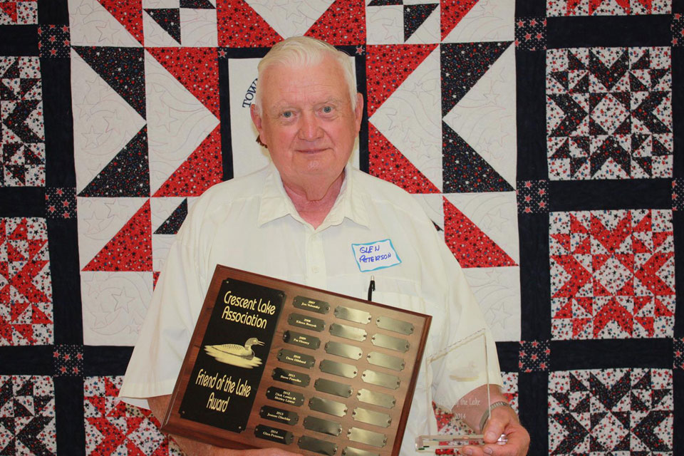 Glen Peterson with “Friend of the Lake Award” Published July 22, 2014 at 960 × 640 in Crescent Lake area ← Previous Next → Glen Peterson with 2014 “Friend of the Lake Award”